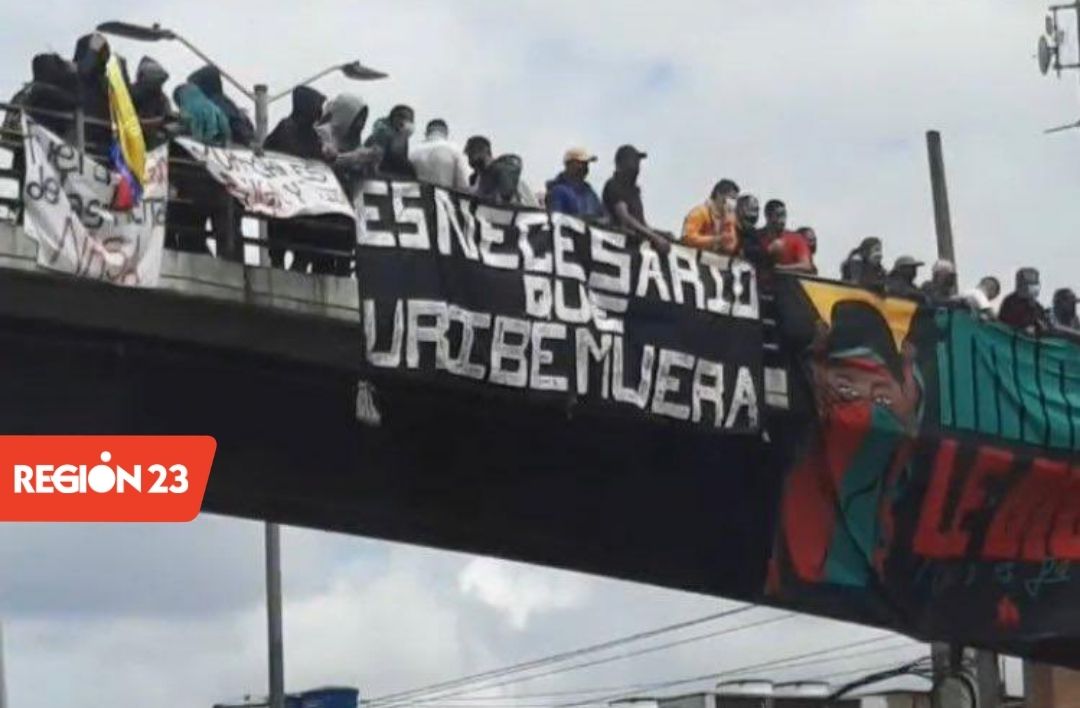En la tarde del 18 de octubre, mientras cientos de ciudadanos recibían a la Minga Indígena al llegar a la capital colombiana, en uno de los puentes por donde estaba programado su recorrido, una valla con el mensaje “Es necesario que Uribe muera” generó indignación en distintos sectores.